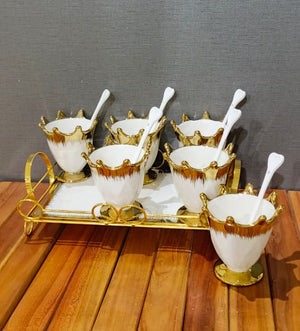 Serve your guests in style with our Dessert Set Ceramic! This elegant set includes a tray, spoons, and enough capacity to serve 6 people. Great for special occasions or everyday use, this versatile set adds a touch of sophistication to any dessert spread.