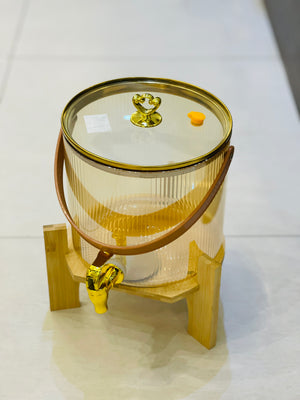 Introducing the Glass Dispenser with a stylish wooden stand. The dispenser features a stunning golden color and a large 5.5 liter capacity, perfect for both hot and cold beverages. Upgrade your drink service with this functional and elegant addition to your kitchen or event setup.