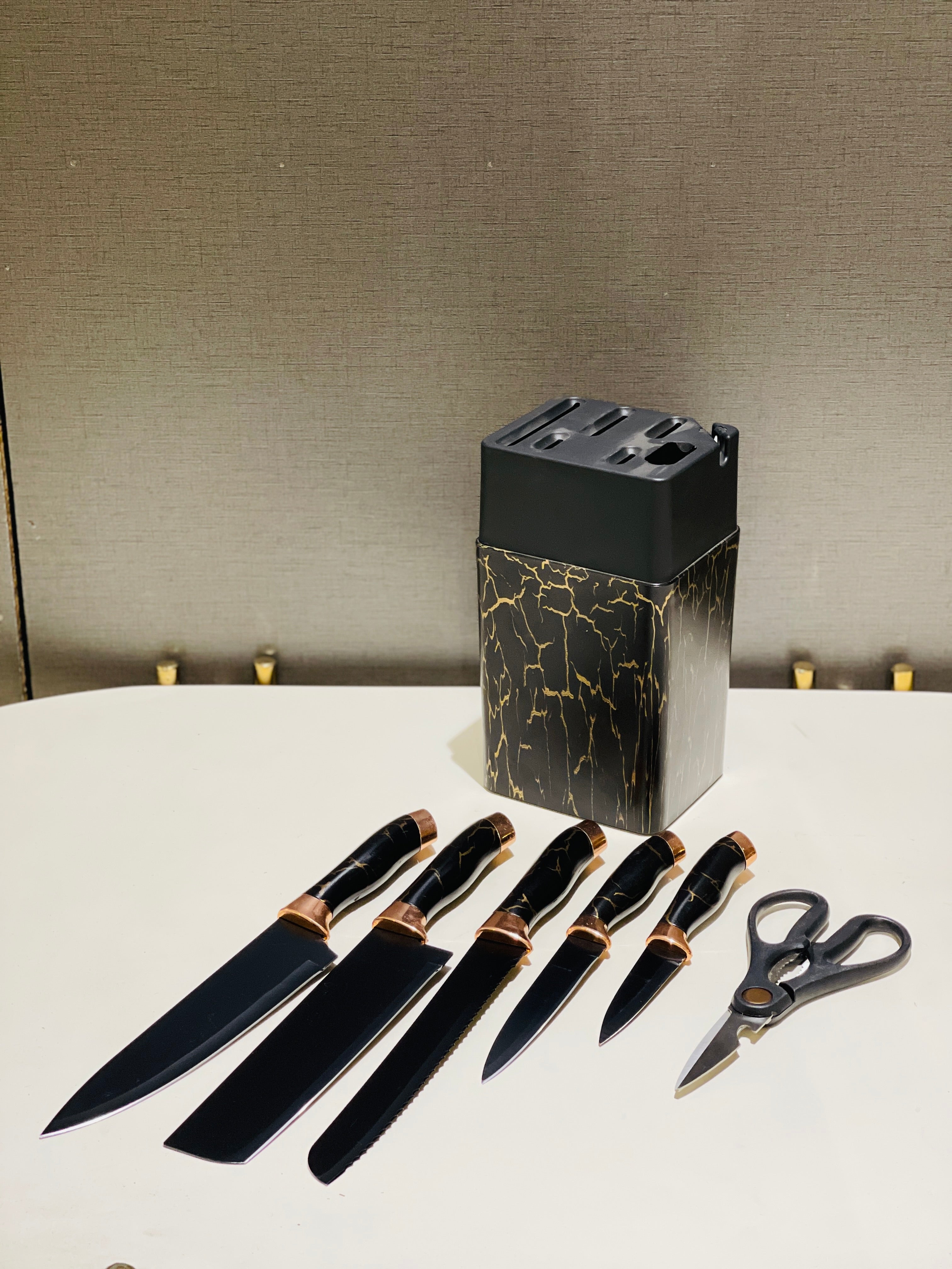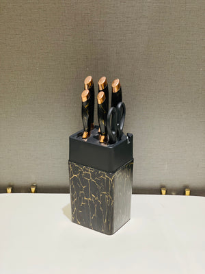 This knife set features an elegant design and highly sharpened knives for a sleek and efficient addition to any kitchen. The included knives holder ensures easy storage and accessibility. Keep your cutting tasks precise and effortless with this high-quality knife set.