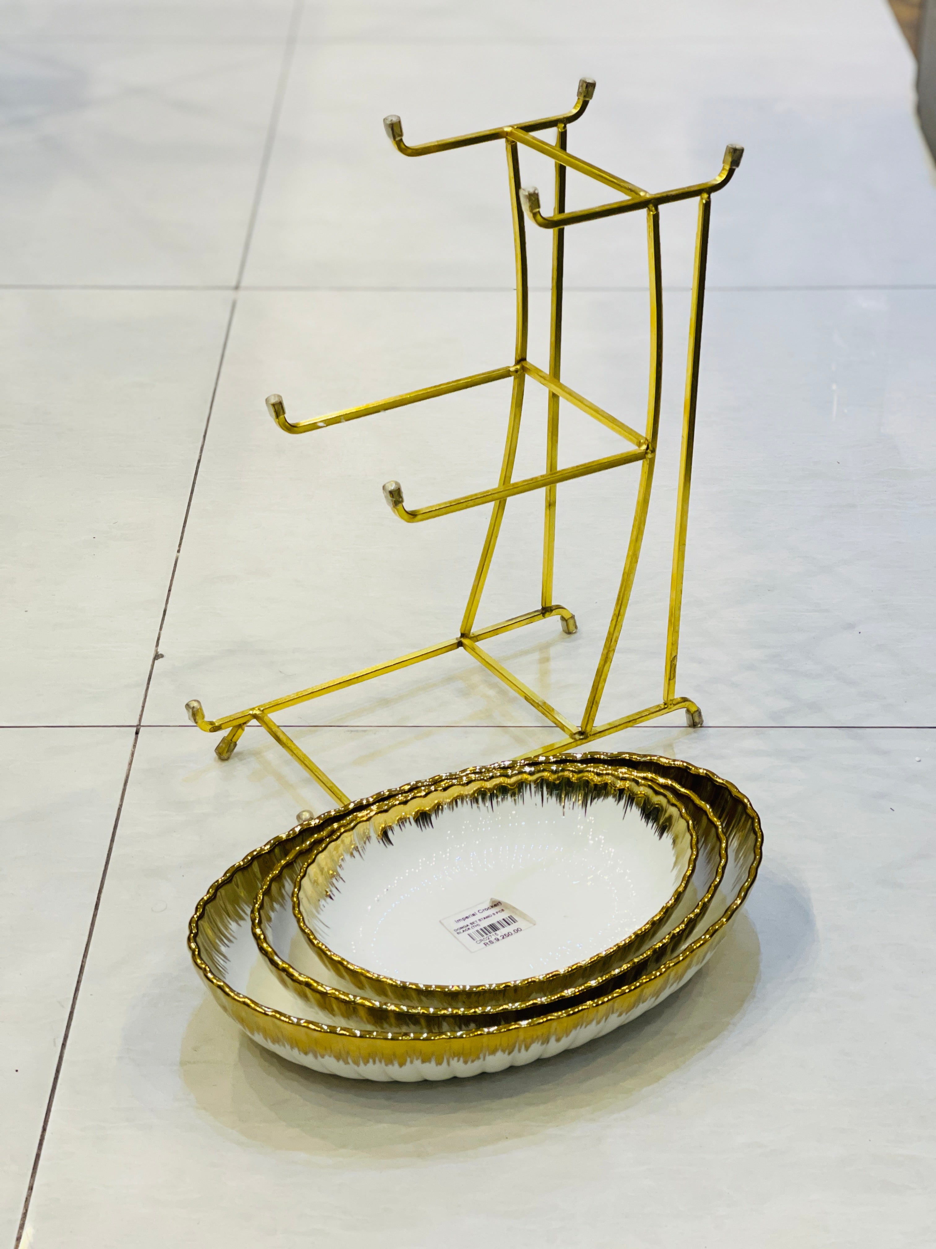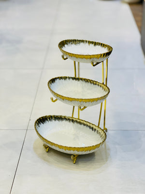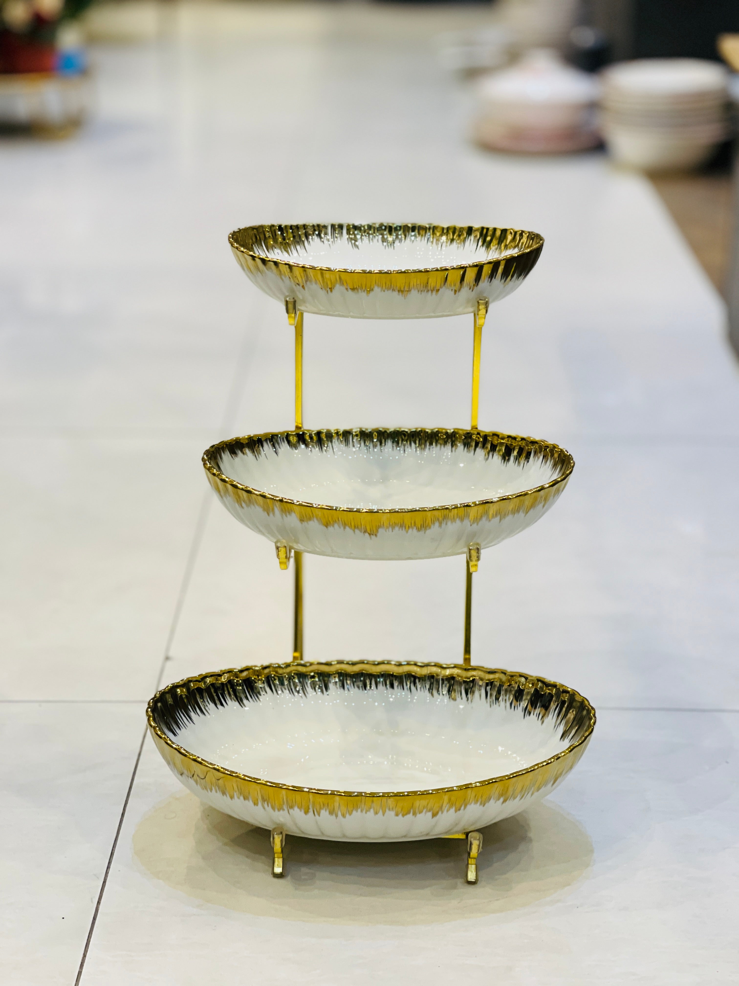 This 3-tier platter with a durable metal frame is perfect for serving snacks, hors d'oeuvres, or desserts at your next party. With three separate dishes, you can easily display a variety of delicious treats for your guests. The sturdy metal frame ensures stability and longevity, making it a practical choice for any occasion.