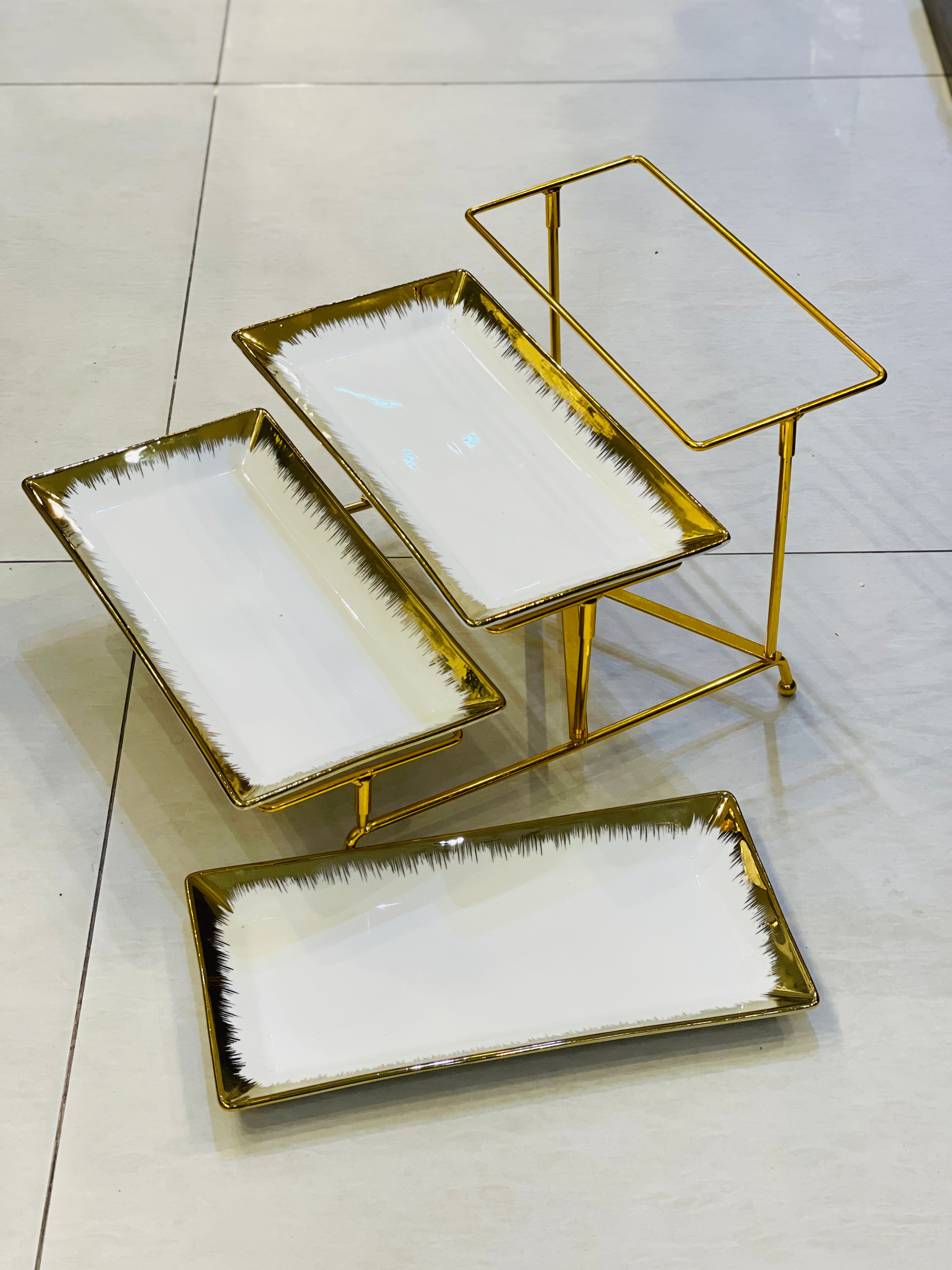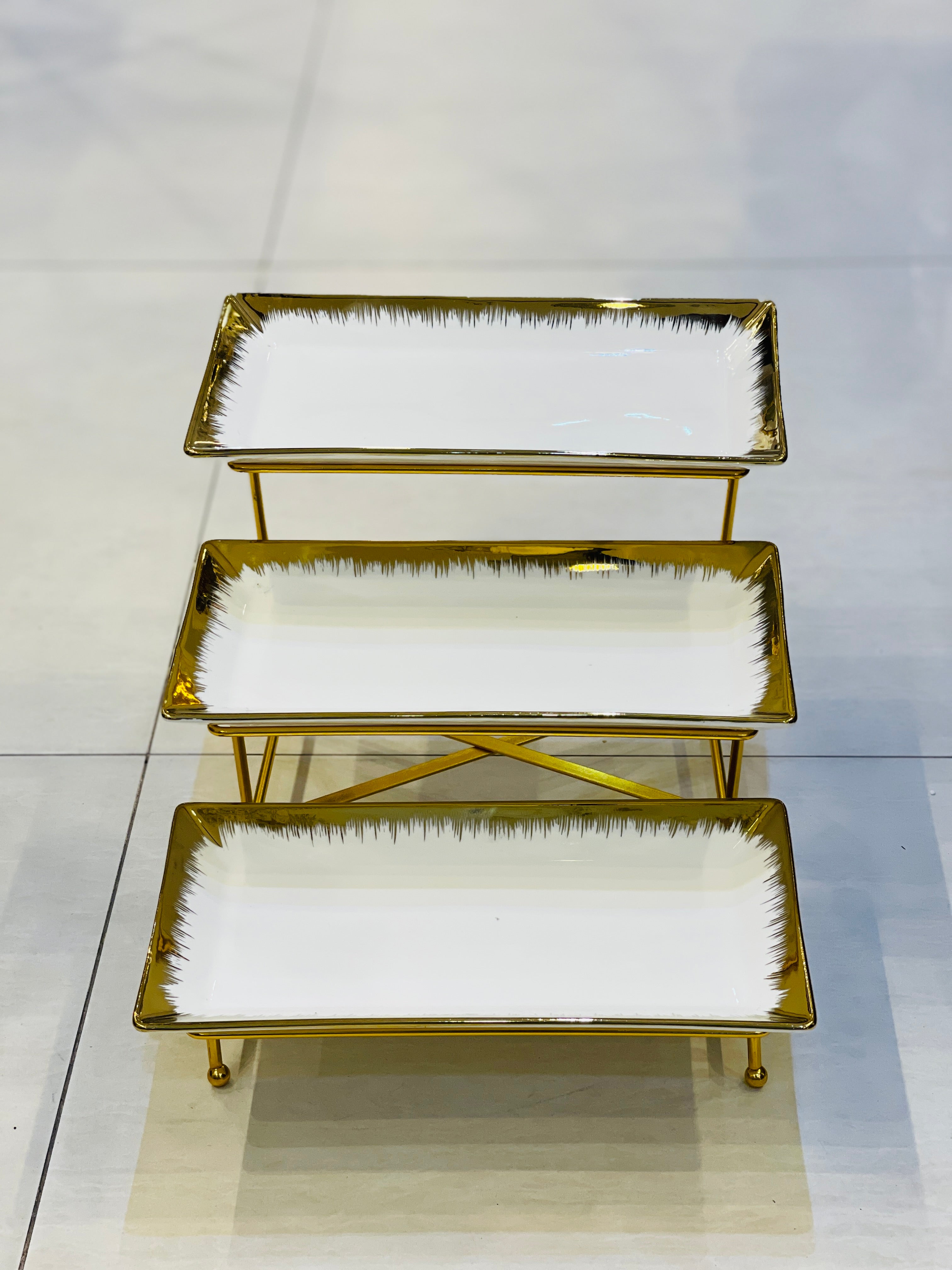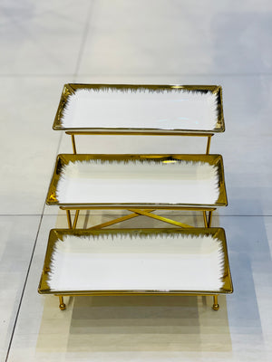 This 3-tier platter with a durable metal frame is perfect for serving snacks, hors d'oeuvres, or desserts at your next party. With three separate dishes, you can easily display a variety of delicious treats for your guests. The sturdy metal frame ensures stability and longevity, making it a practical choice for any occasion.