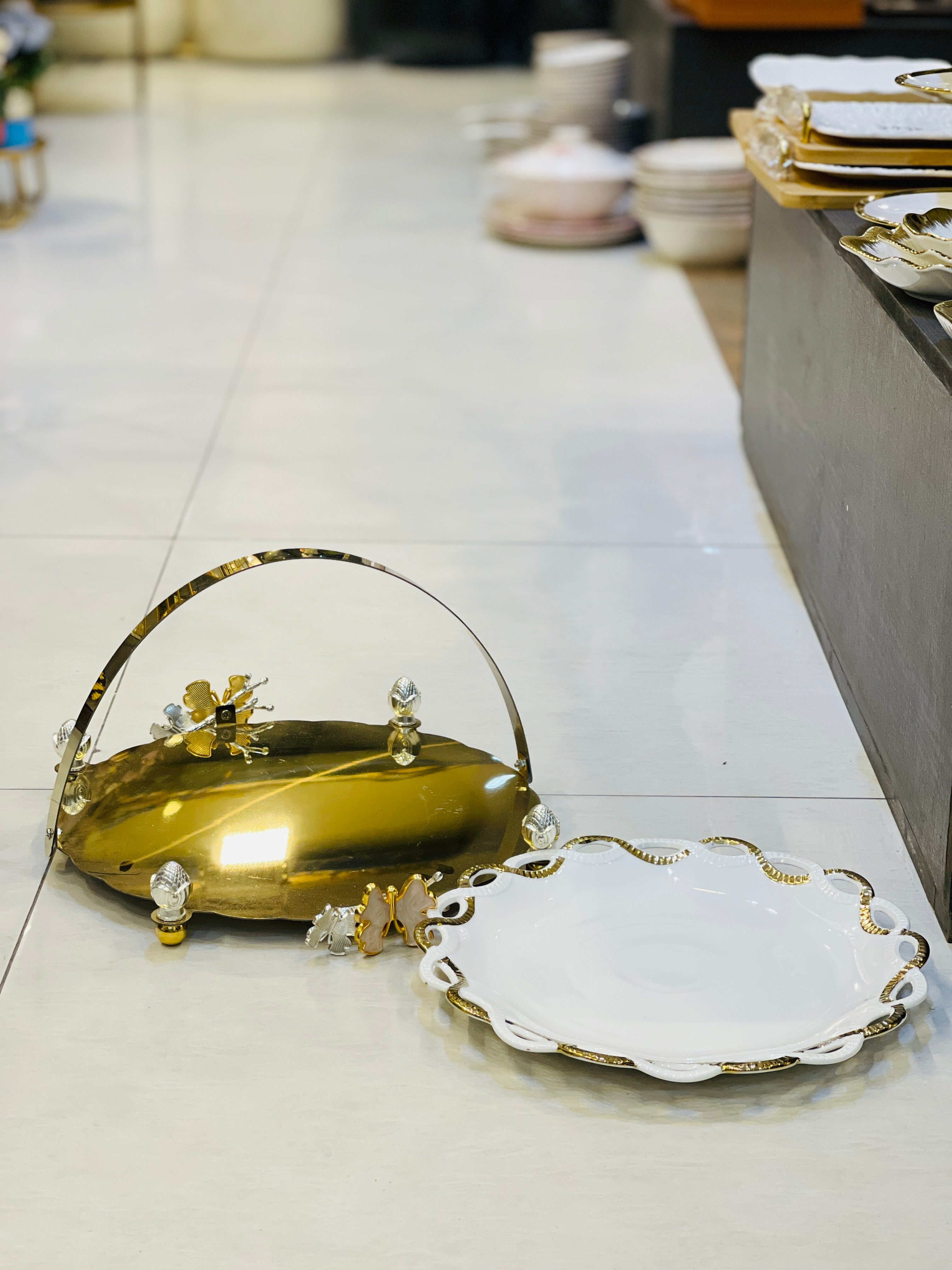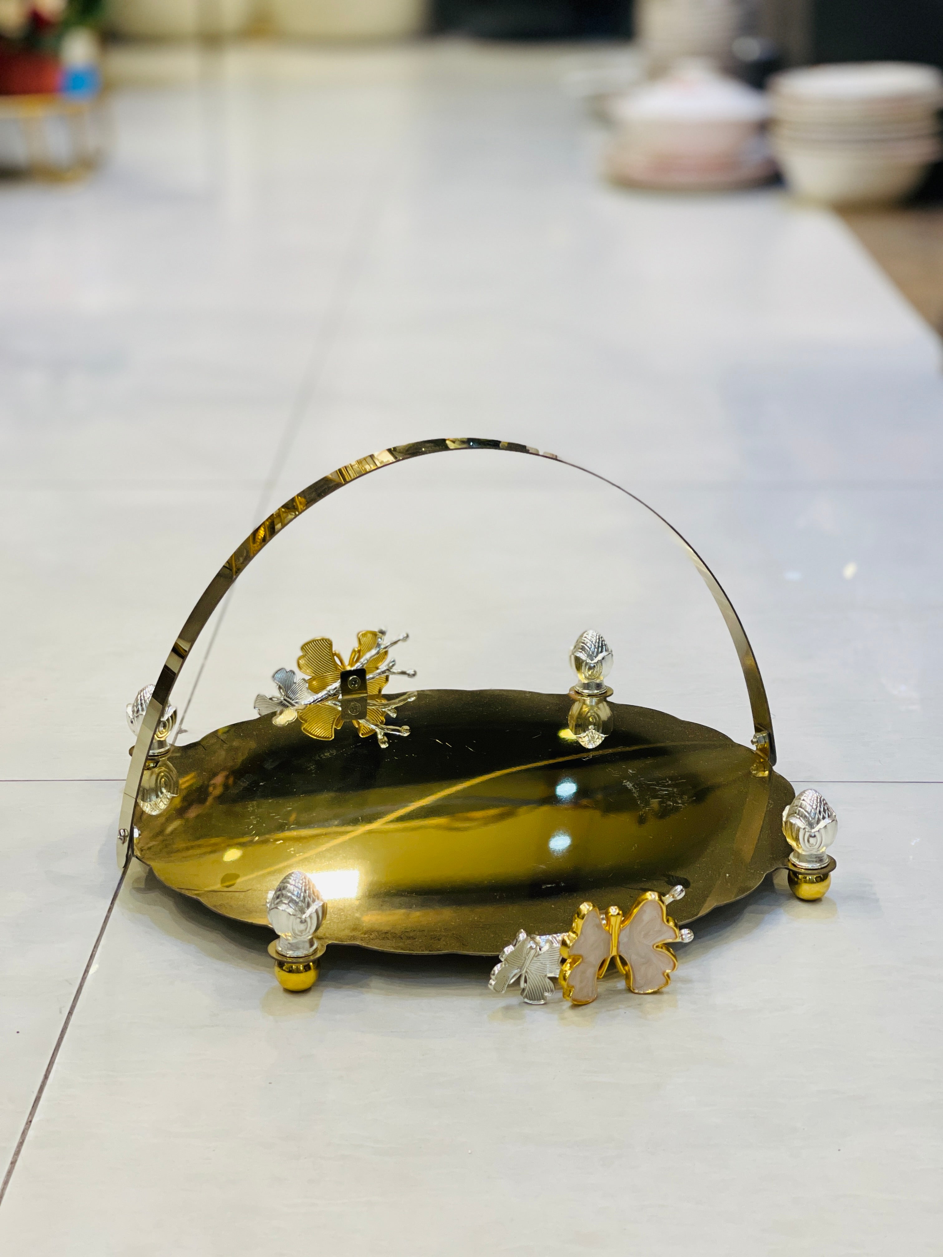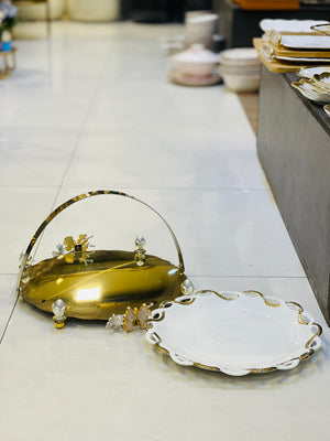 Introducing our elegant Platter Ceramic with Golden Frame. This luxurious serving platter is crafted with high-quality ceramic and a stunning golden frame. Perfect for hosting parties or special occasions, this platter adds a touch of sophistication to any event. Experience the perfect blend of style and functionality with our Platter Ceramic with Golden Frame.
