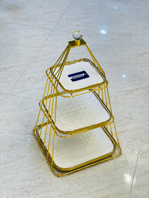 This 3-tier serving platter features a golden border and metal frame for an elegant and durable design. Made of ceramic material, it's perfect for displaying and serving various foods, making it a functional and stylish addition to your dining experience.