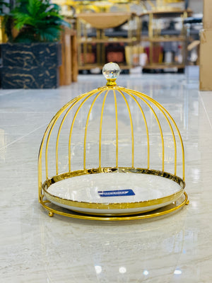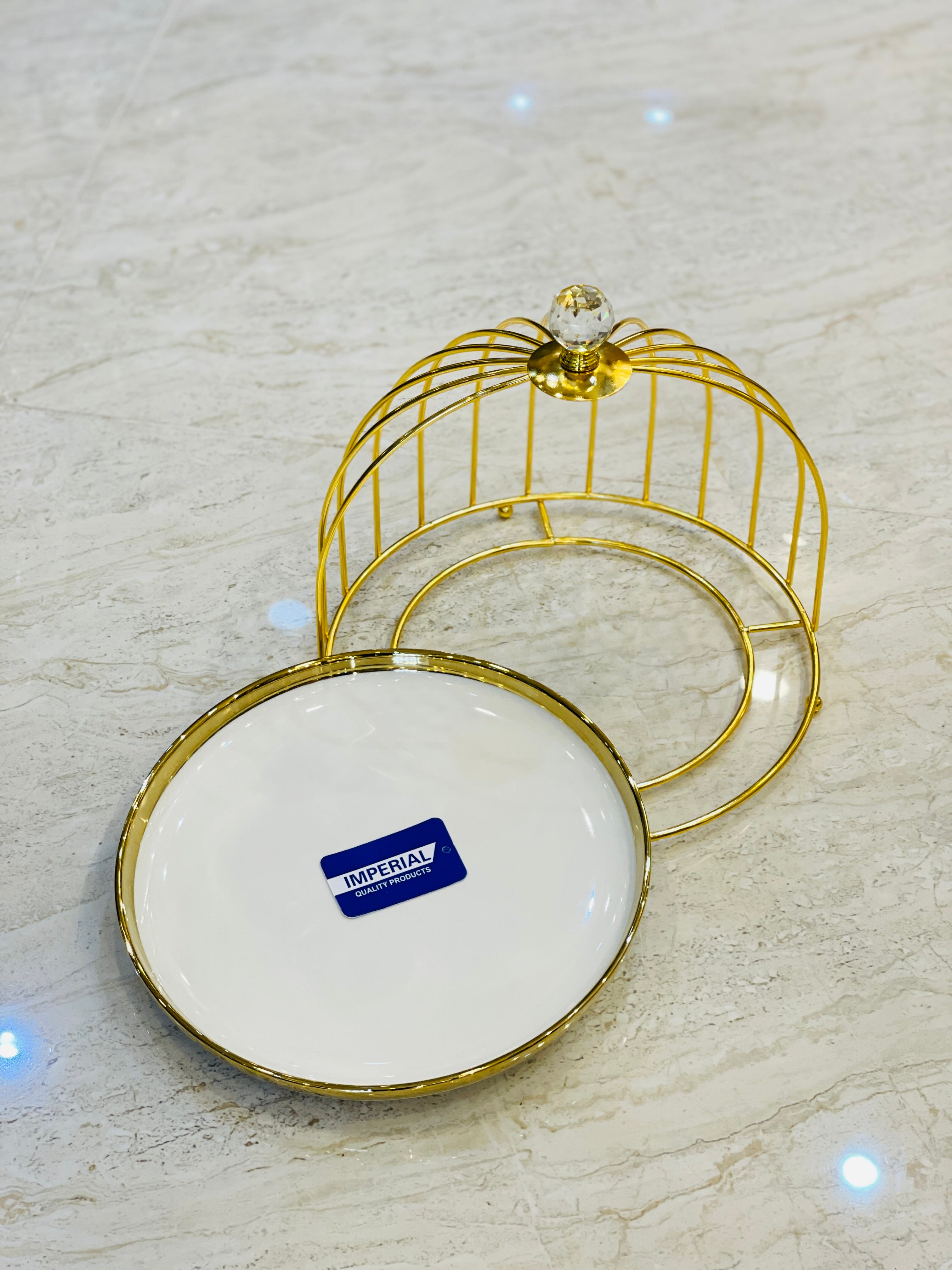 This  serving platter features a golden border and metal frame for an elegant and durable design. Made of ceramic material, it's perfect for displaying and serving various foods, making it a functional and stylish addition to your dining experience.