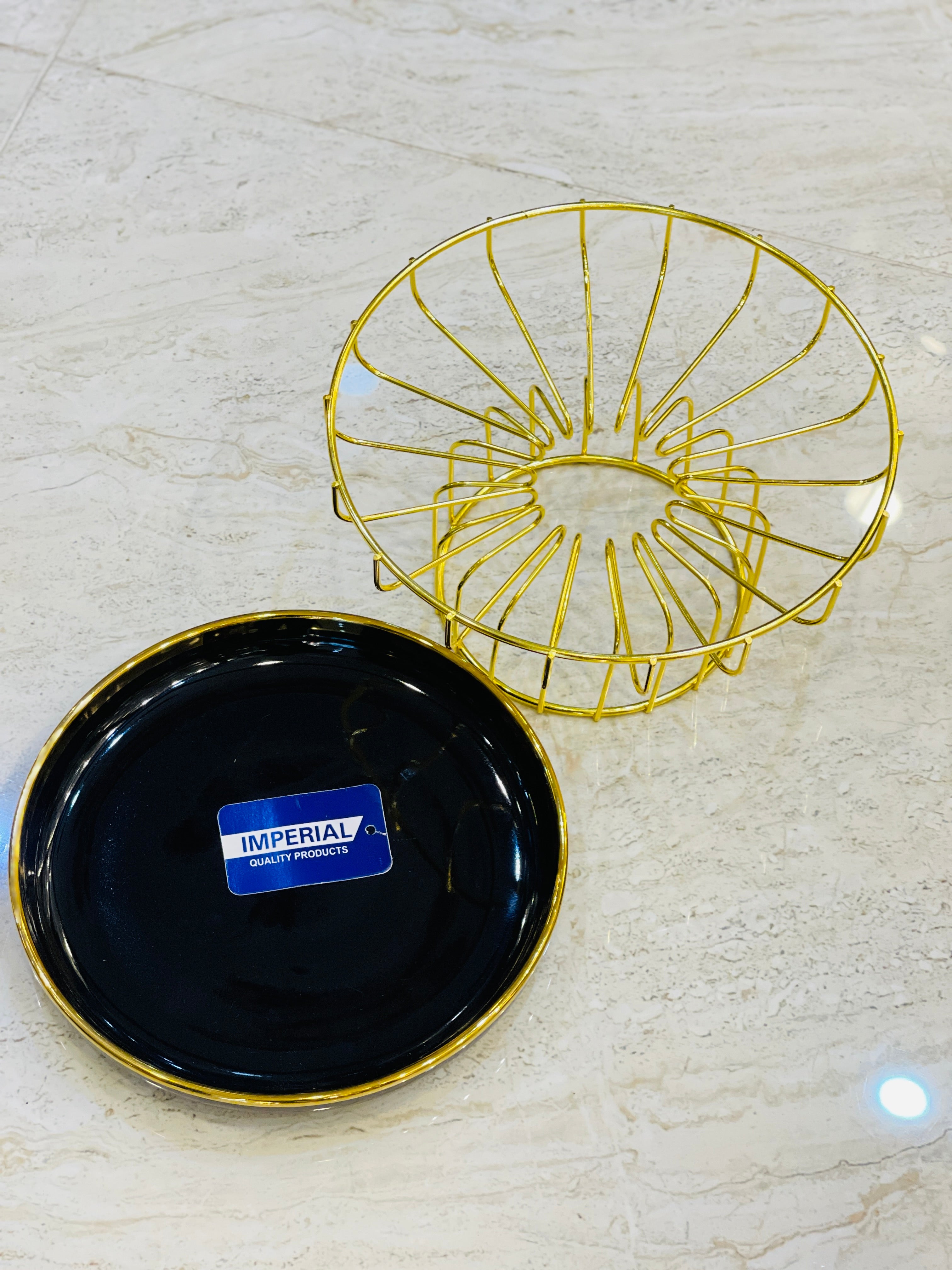 This serving platter features a golden border and metal frame for an elegant and durable design. Made of ceramic material, it's perfect for displaying and serving various foods, making it a functional and stylish addition to your dining experience.