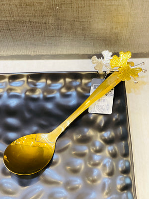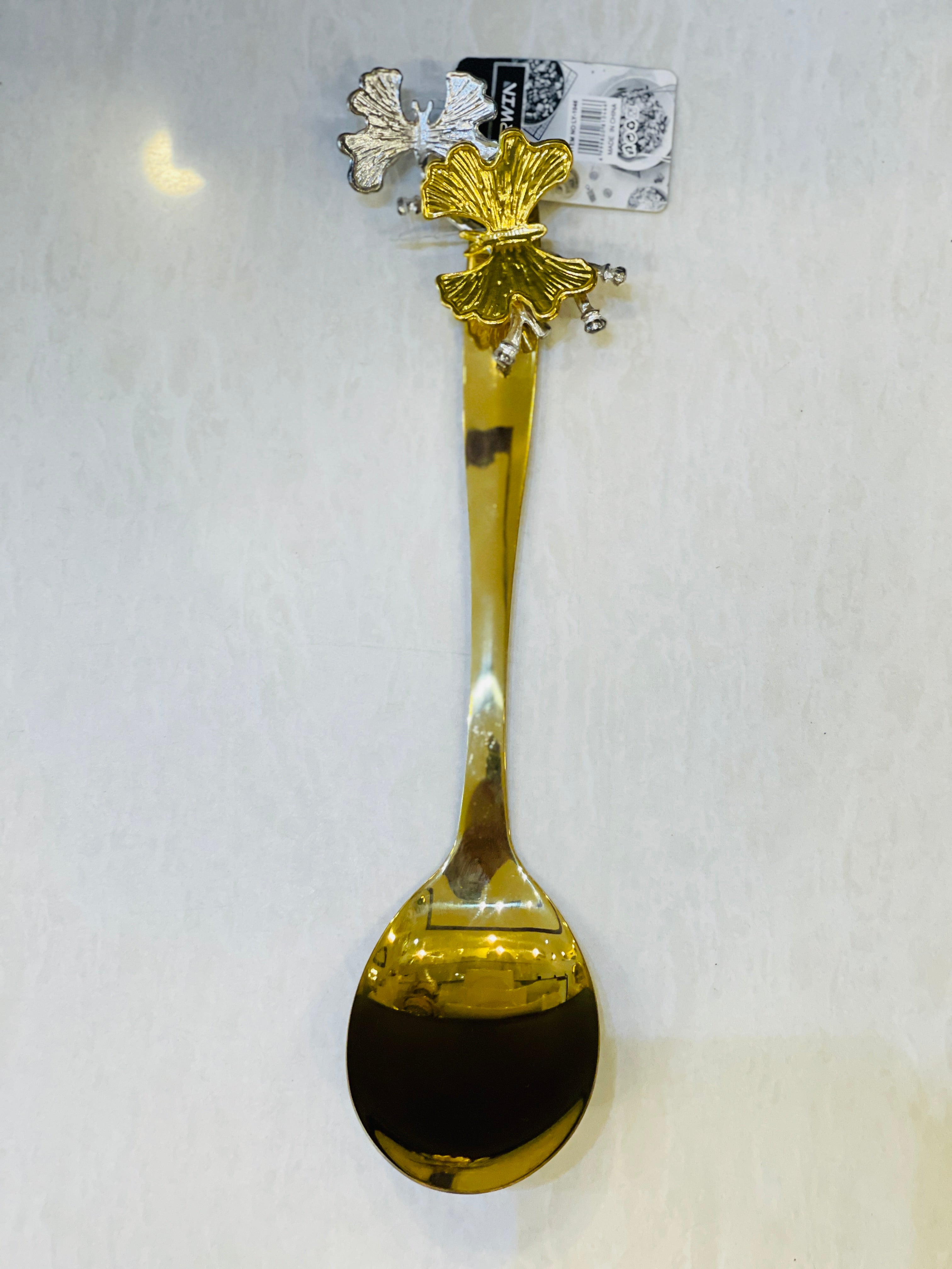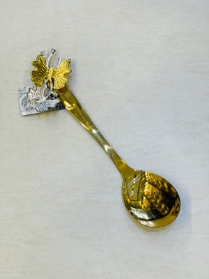 Stainless steel serving spoon golden electrolyte with golden and silver butterflyExpertly crafted from durable stainless steel, this serving spoon boasts a stunning golden electrolyte finish adorned with delicate golden and silver butterflies. Add a touch of elegance to your dining experience and elevate your serving game with this exquisite piece.