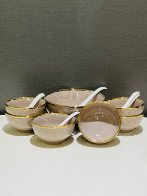 Enhance your dining experience with our elegant Soup Set. Made from high-quality ceramic material, each piece features a luxurious golden border. The set includes 14 pieces, perfect for family dinners or special occasions. Elevate your table setting and impress your guests with this stunning and functional soup set.