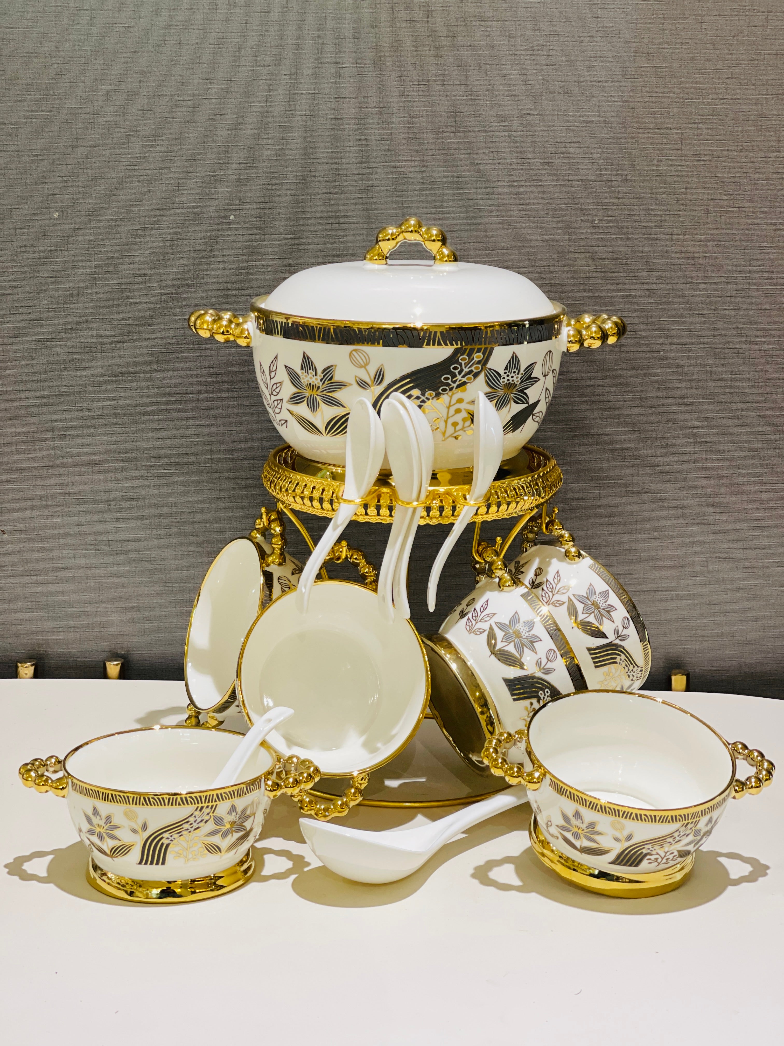 Organize your kitchen with our elegant Soup Set Metal Stand. Its hanging bowls feature a sleek design, making it a stylish and functional addition to your cooking arsenal. Perfect for serving soups and stews, this stand will elevate your dining experience.