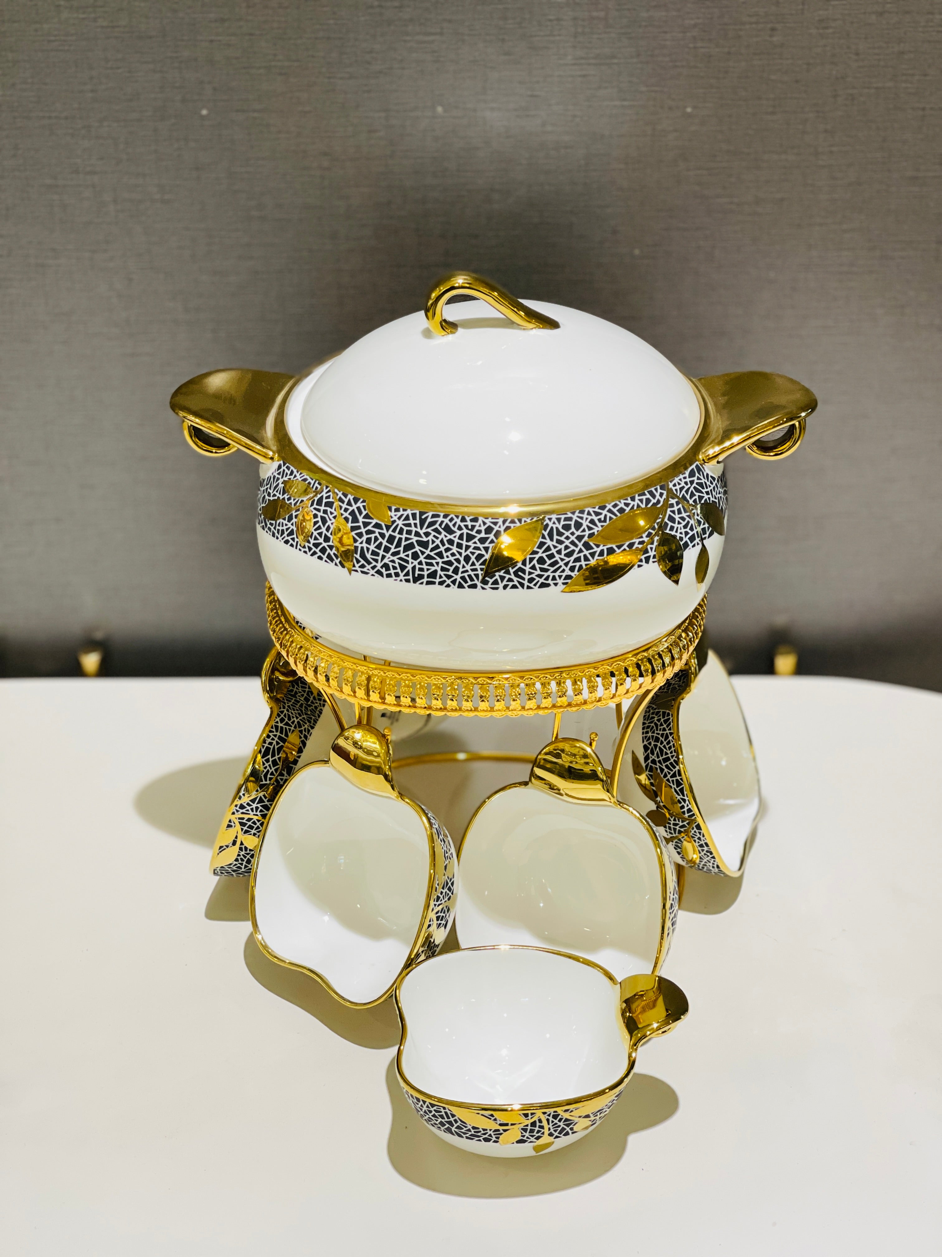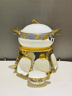 Take your soup to the next level with our elegant Soup Set. Made of high-quality ceramic material, this set features a beautiful golden design that will add a touch of luxury to any kitchen. The included metal stand and hanging lid stand make it easy to serve and store your soup. Upgrade your dining experience today.