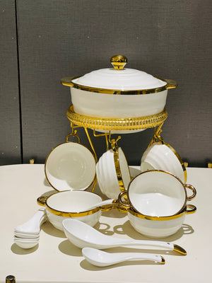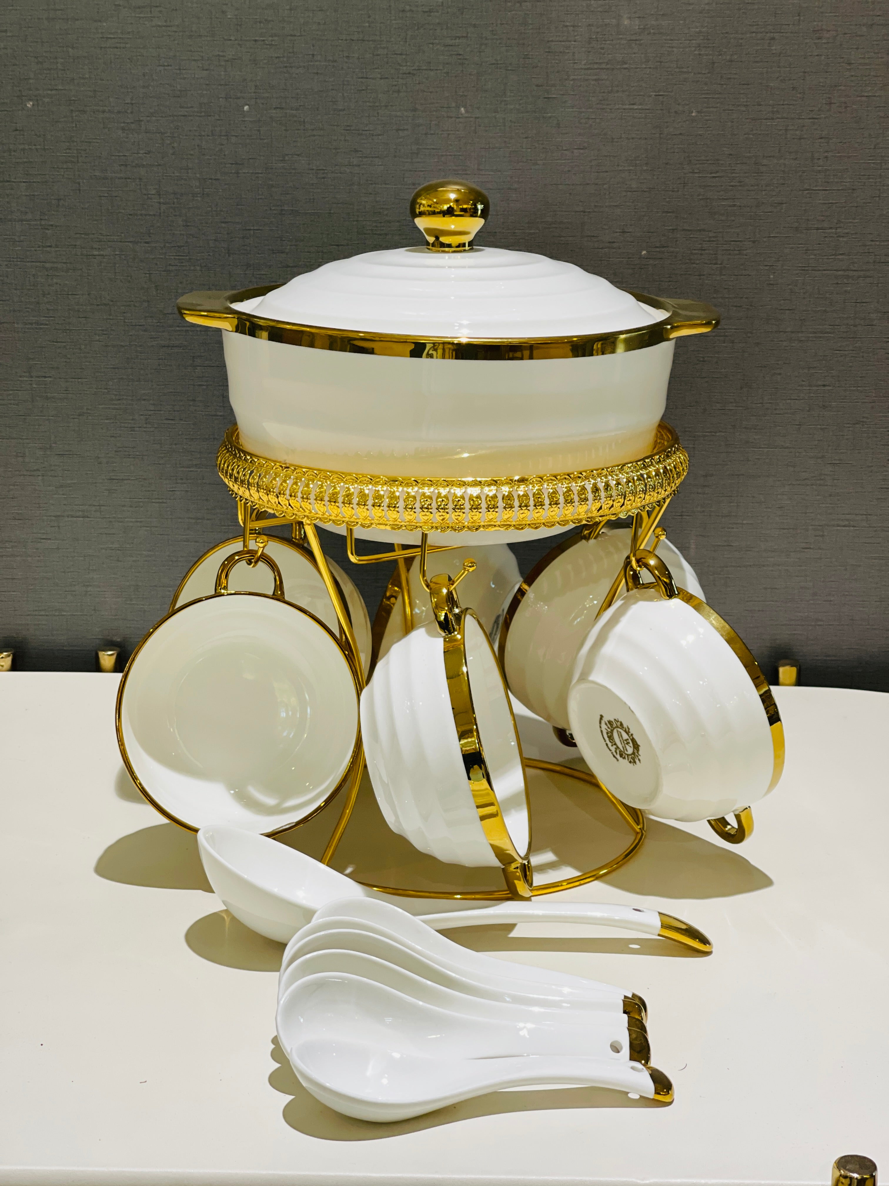 Expertly crafted metal stand with a beautiful golden border, designed to securely hold hanging bowls for a stunning soup set. Elevate your dining experience with this elegant and practical addition to your table, perfect for entertaining or everyday use.