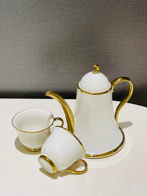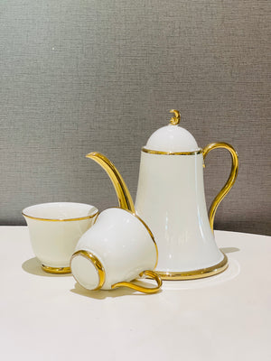"A beautiful tea set complete with tray, crafted from elegant ceramic and featuring a stunning golden design. Enhance your tea-drinking experience with this sophisticated set, perfect for hosting guests or enjoying a peaceful cup alone."