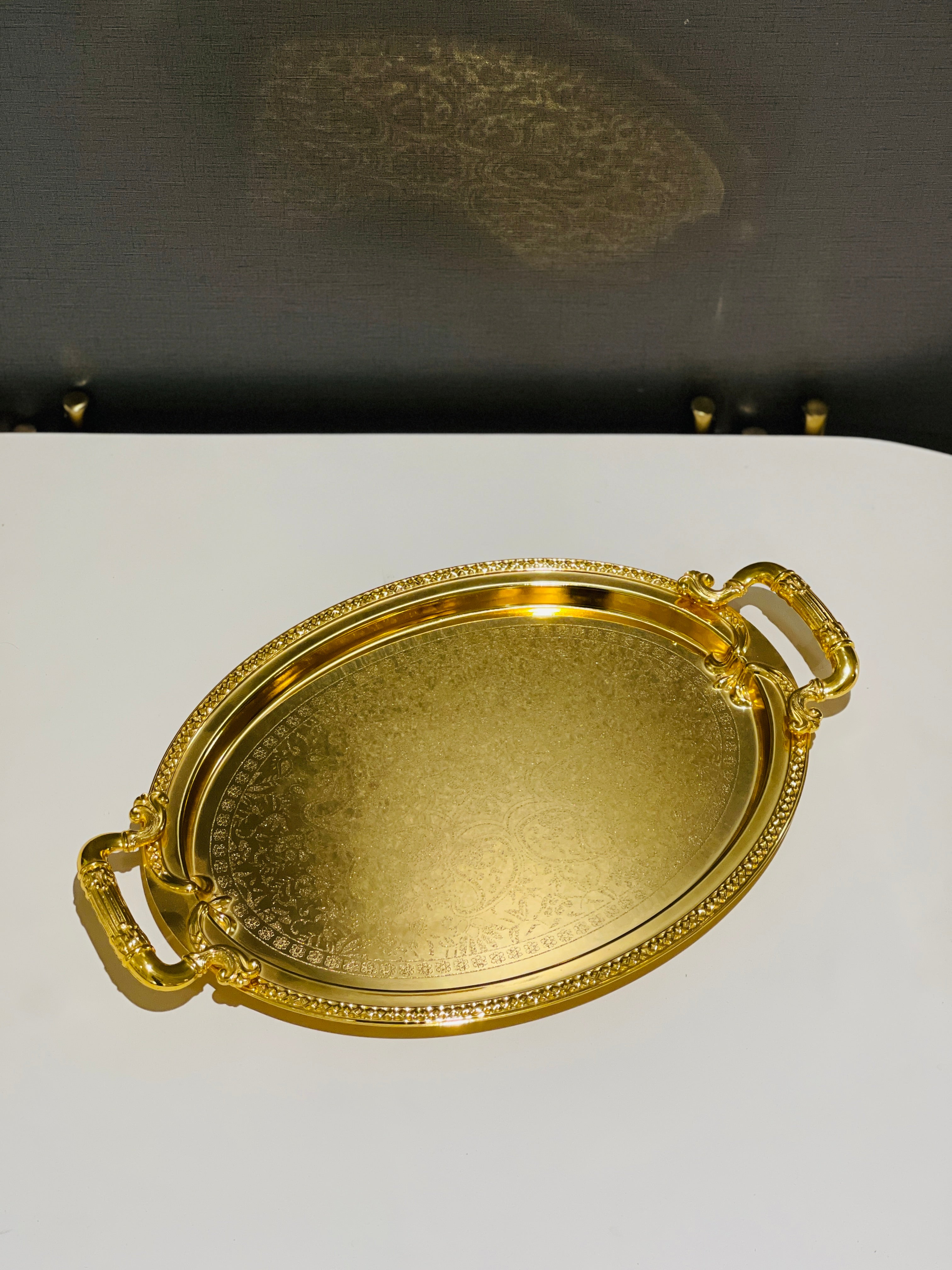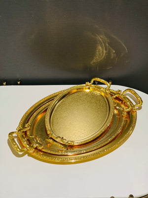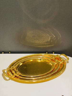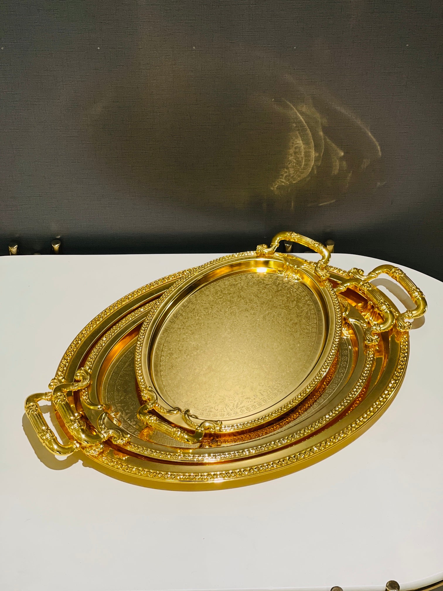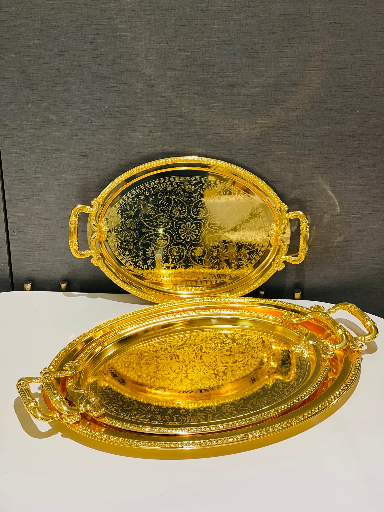 This Tray Set Stainless Steel is a 3-piece set that boasts a rust-proof golden electrolyte finish. Perfect for serving, organizing, and decorating, these trays add a touch of elegance and functionality to any space. Made from durable stainless steel, they are built to last and maintain their sleek appearance.
