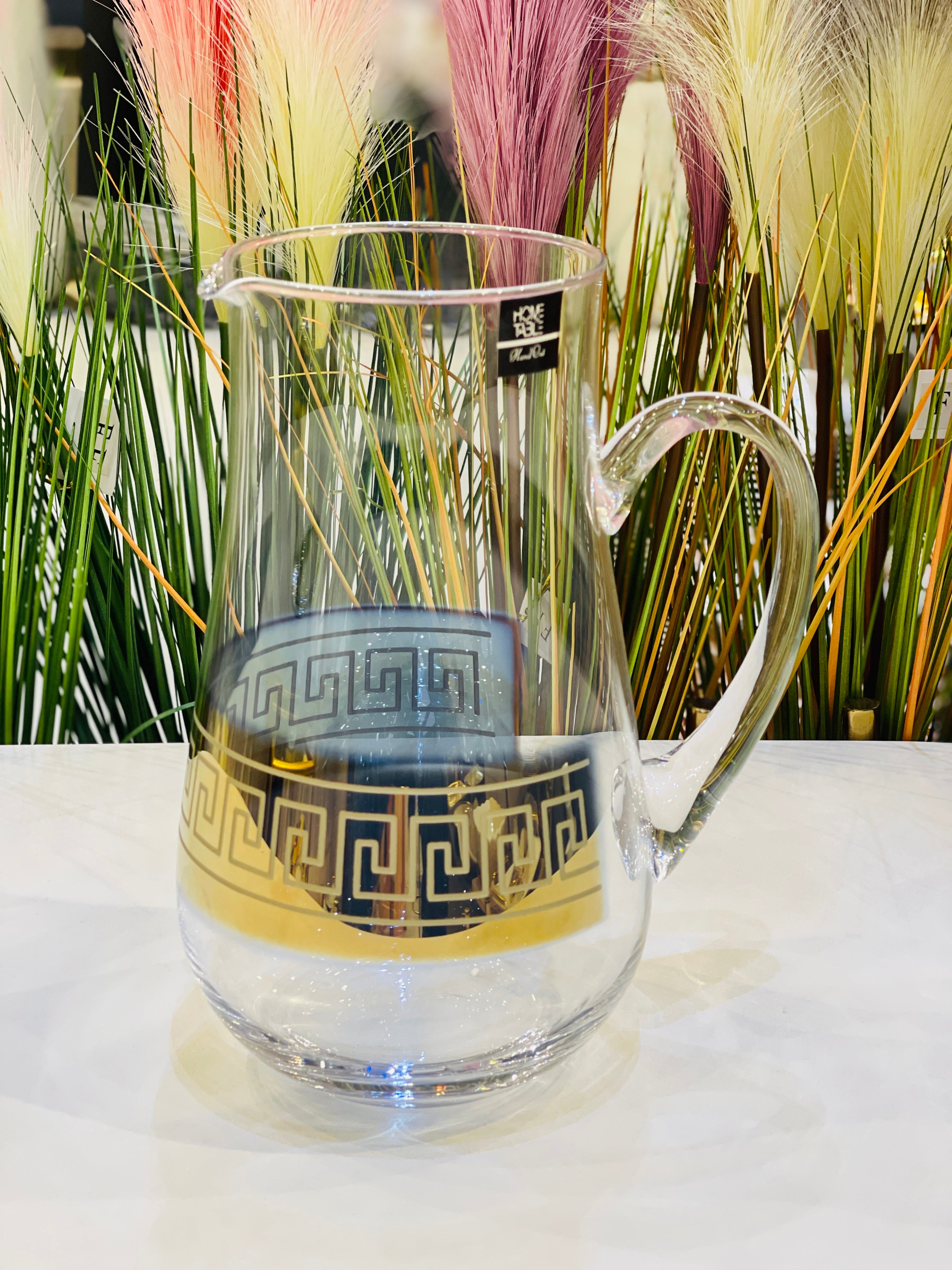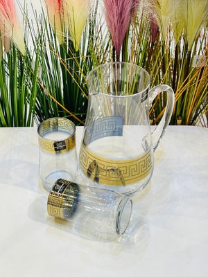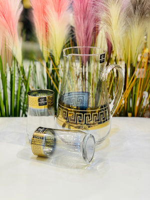This elegant water set contains 7 pieces with a beautiful golden border. Perfect for adding a touch of sophistication to your dining experience. Made with high-quality materials, this set is not only aesthetically pleasing, but also durable and functional. Elevate your table setting with this exquisite water set.