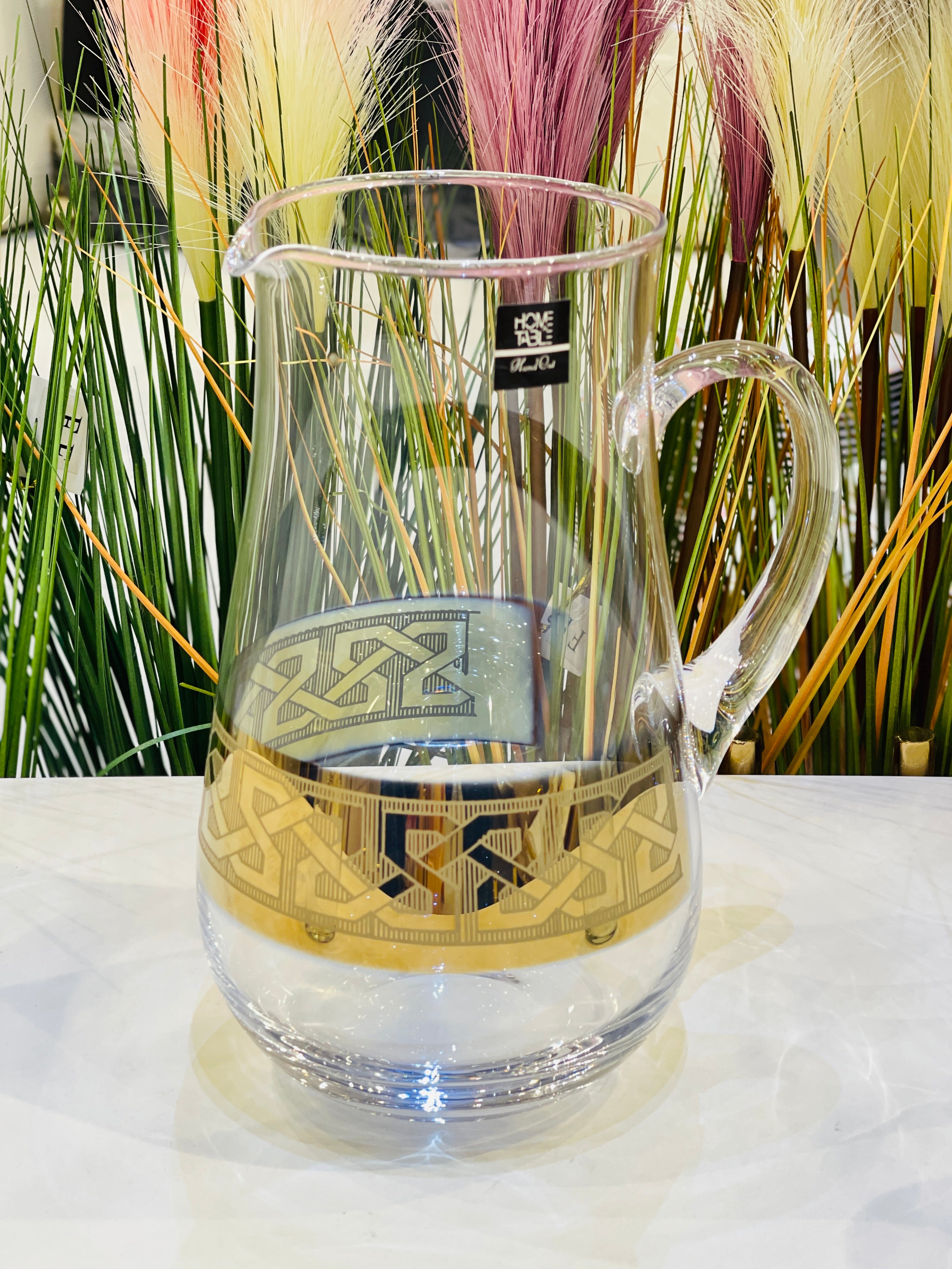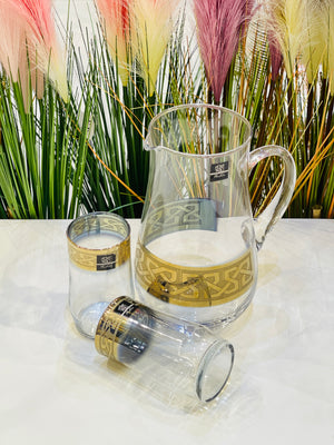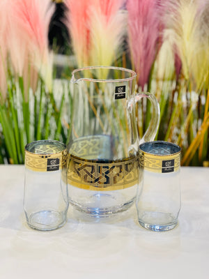 This elegant water set contains 7 pieces with a beautiful golden border. Perfect for adding a touch of sophistication to your dining experience. Made with high-quality materials, this set is not only aesthetically pleasing, but also durable and functional. Elevate your table setting with this exquisite water set.